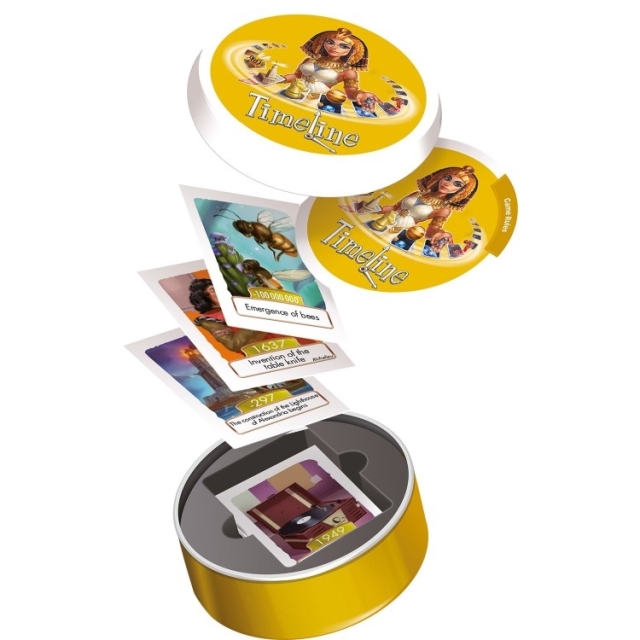 黄色の缶に入った『タイムライン:博識編』は、世界史上のさまざまな事象を総合的に扱った55枚のセットです。