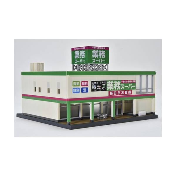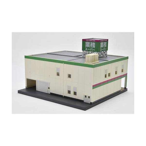 セット内容: 建物、ベース、屋上看板、貯水槽×2、ゴミ箱、カート×2、シール