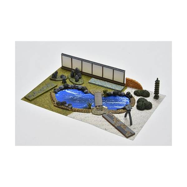 セット内容: 土塀、竹垣、小橋、生垣、菖蒲、石畳、池の淵4種×各2、石灯籠、庭石、ジオラマシート