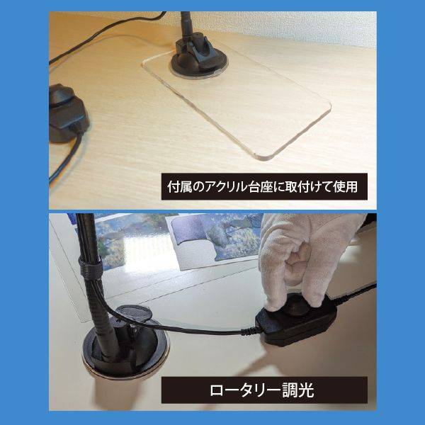 ・作業の環境に合わせて吸着、台座の2種類の取り付けが可能。