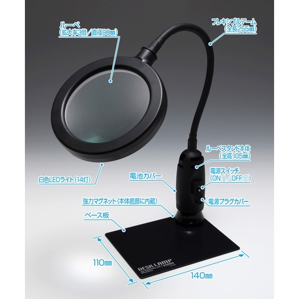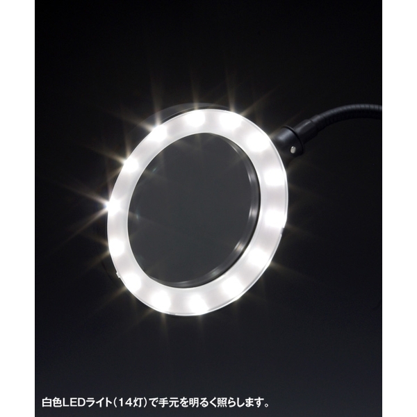・精密作業に役立つルーペに手元照明用の白色LEDライト(14灯)をセットしたスタンドです。