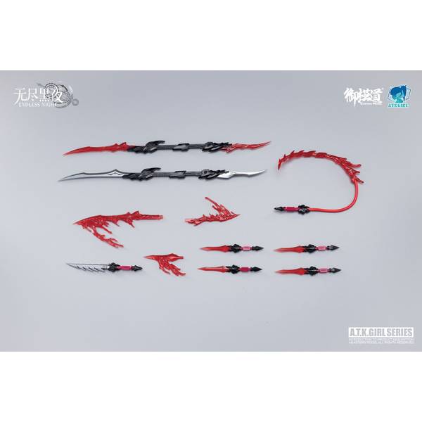 素体×1、素体(武装)×1、メカコウモリ「Laura」×1、鞭×1、短刀(赤)×4・(白)×1、銃剣(長)×2、銃剣(短)×2、銃剣用エフェクトパーツ×2、短刀(赤)用エフェクトパーツ×1、素体用ハンドパーツ×6、武装素体用ハンドパーツ×3、塗装済み顔パーツ×5、塗装無し顔パーツ×5、デカール×1、アイパッチ用デカール×1、フラッシュダイヤシール(パーツにつけるシール)×1が付属します。
