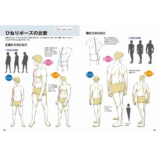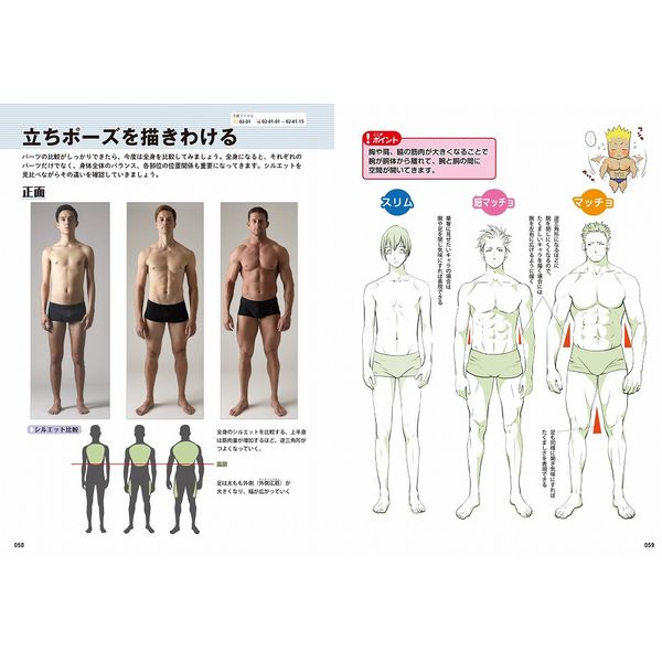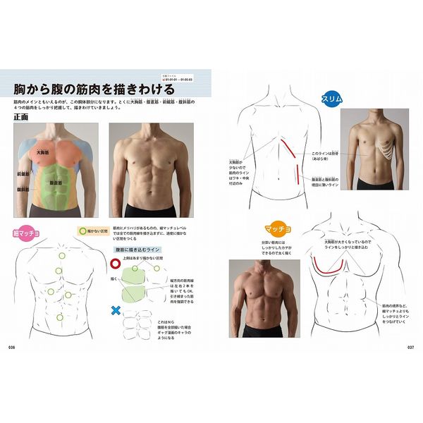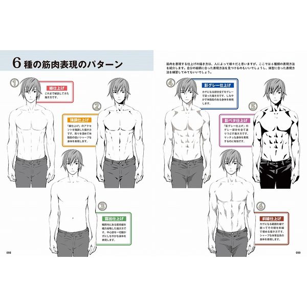 本書では、基本となる筋肉構造を踏まえつつ、スリム・細マッチョ・マッチョの3体型にわけて、それぞれの肉体の特徴と描きわけのポイントを解説します。