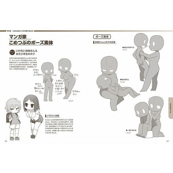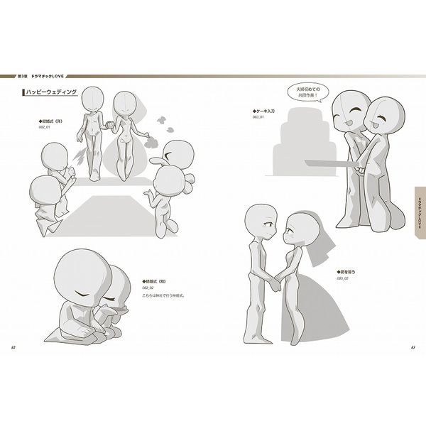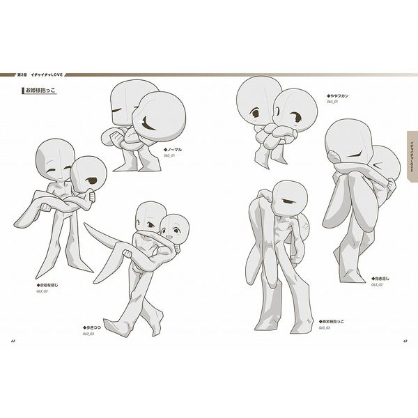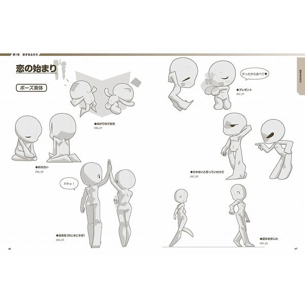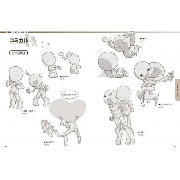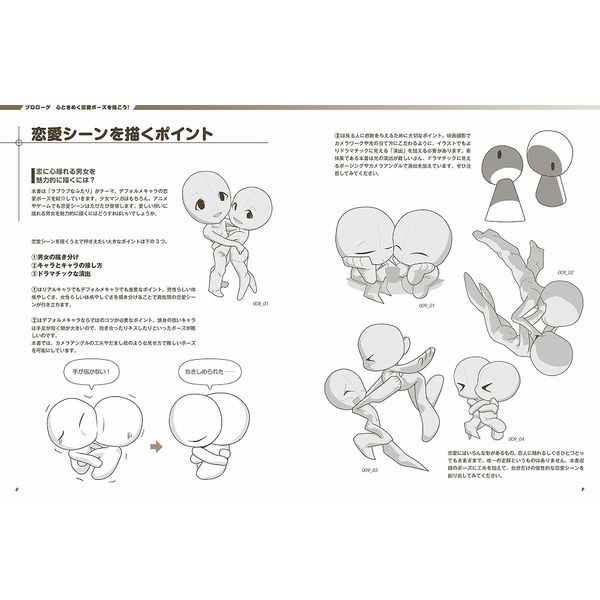 本書では、2~4頭身のデフォルメキャラの個性豊かな恋愛ポーズの数ーを収録。