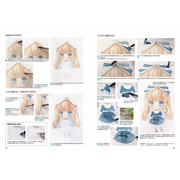 第1章透明水彩の基本的な使い方水彩の基本となる平塗りと重ね塗り、にじみとぼかし、グラデーションなどを、2タイプのミニキャラクターの肌や髪の毛、服やクツ、リボンやフリルを塗りながら、楽しく解説。