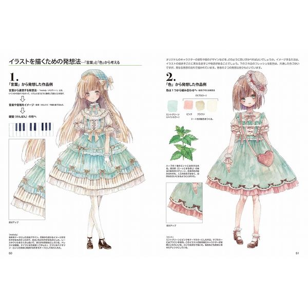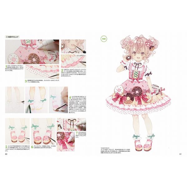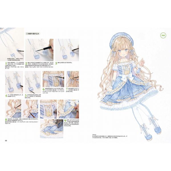 美しいロリータ服とキャラのデザインを、どのように発想しているのかが伝わるように、ラフ~完成までの水彩メイキングをていねいに解説します。