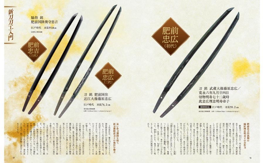 ▲新刀を代表する刀工達の作品を紹介。掲載刀工は埋忠明寿、肥前忠広、堀川国広、丹波守吉道、越前康継など。華やかな新刀の刀剣をお楽しみください