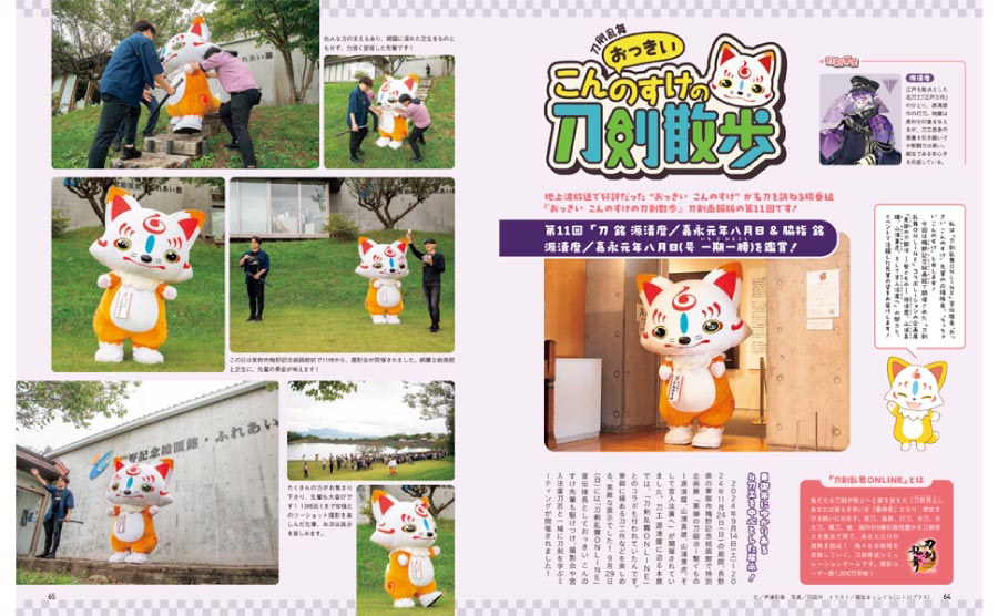 ▲おっきい こんのすけが全国の名刀を訪ね歩く大人気連載「おっきい こんのすけの刀剣散歩」を掲載。今回、先輩が訪れたのは東御市梅野記念絵画館・ふれあい館で開催された「東御の刀鍛冶―繋ぐもの―源清麿、山浦真雄、山浦兼虎、そして宮入法廣へ」。新々刀を代表する刀工、源清麿を学びます。